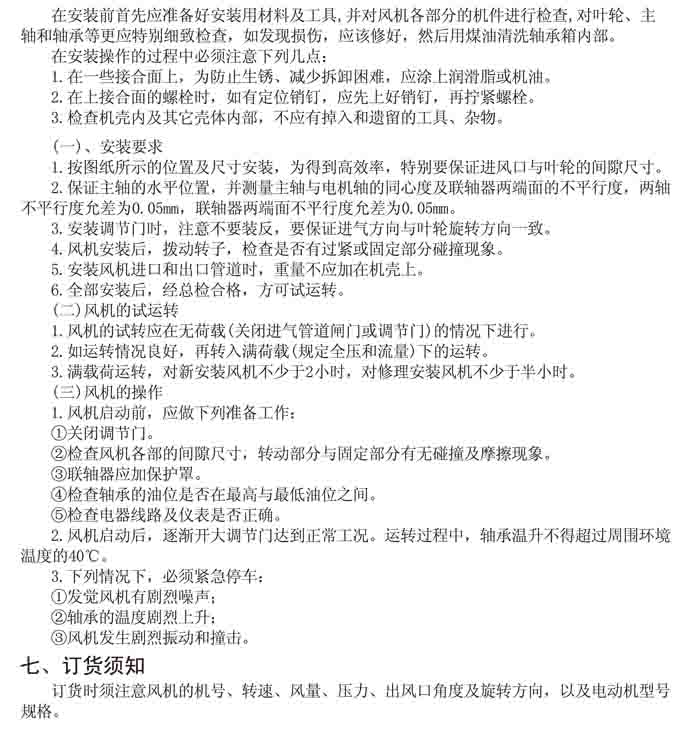 一、風(fēng)機選用參考、安裝維護(hù)使用說明、常見故障分析、訂貨注意事項